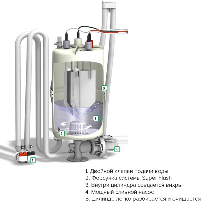 Эта система очистки во время опустошения емкости создает движение воды, которое поднимает со дна минеральные осадки и не дает им скапливаться в емкости.