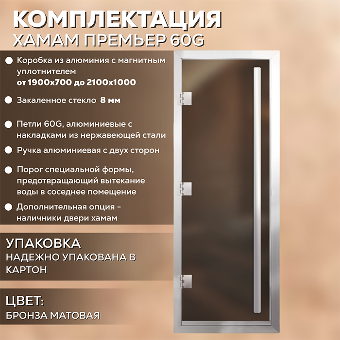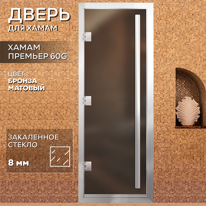 Стеклянная дверь для хамама Престиж с вертикальной ручкой Бронза Матовая