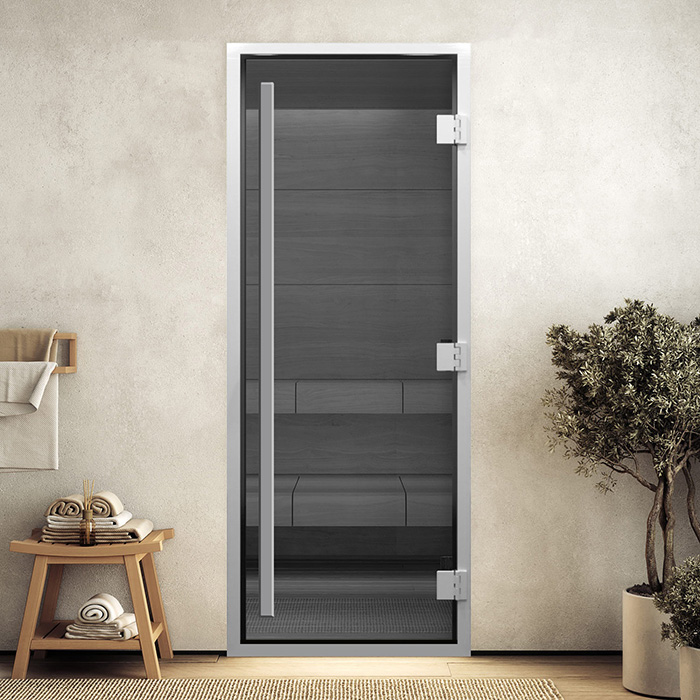 Удобная форма ручки. Петля в цвет профиля- 3 штуки. Слив конденсата в сторону хамама.