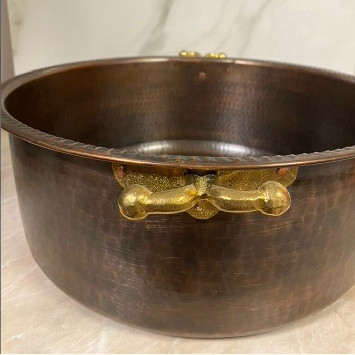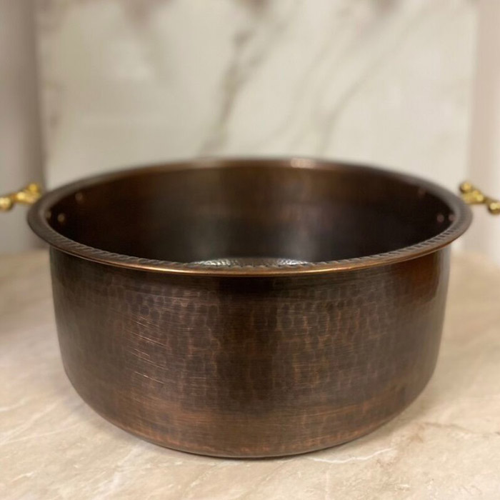 Глубокий медный таз, предназначен для создания специального мыльного раствора, с помощью которого проводится мыльный массаж.