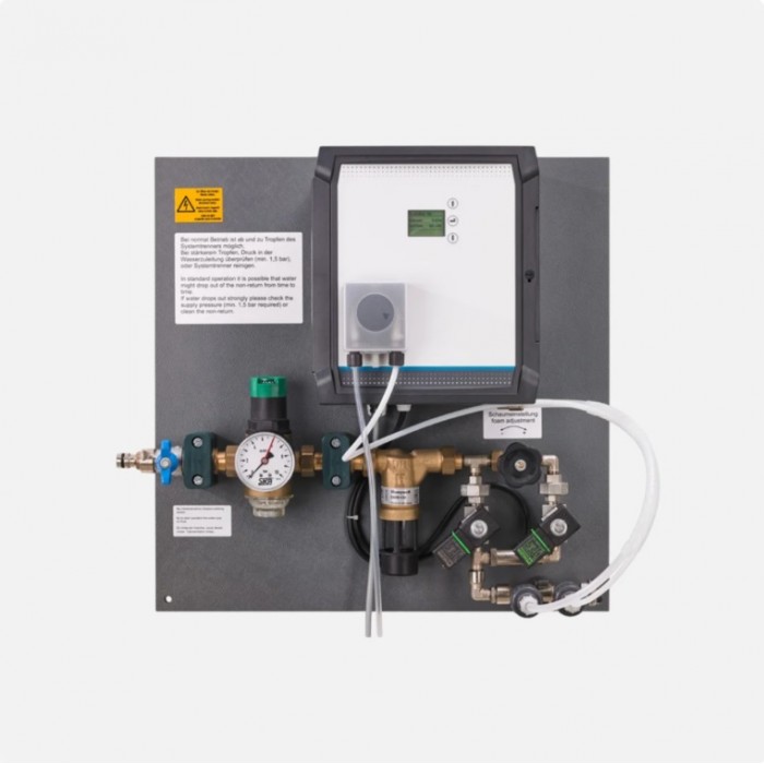 Консистенция пены регулируется количеством воды и интенсивностью дозирования концентрата: настройки задаются на небольшом ЖК-дисплее.