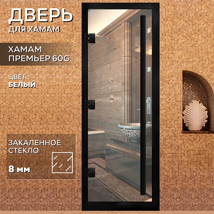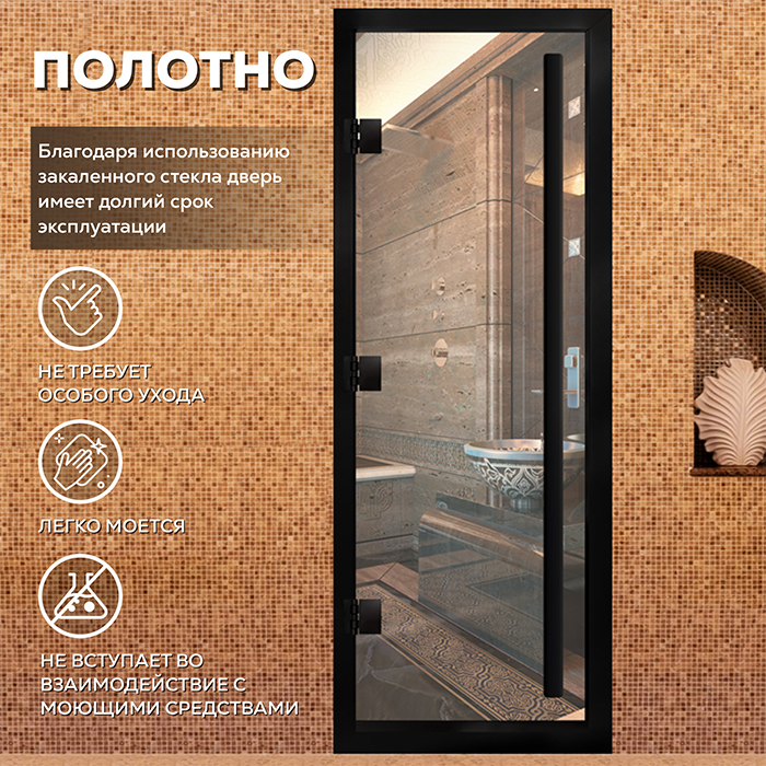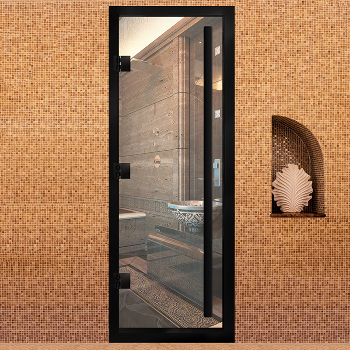 Новинка Стеклянная дверь для хамама Престиж с вертикальной ручкой Прозрачная с черным профилем