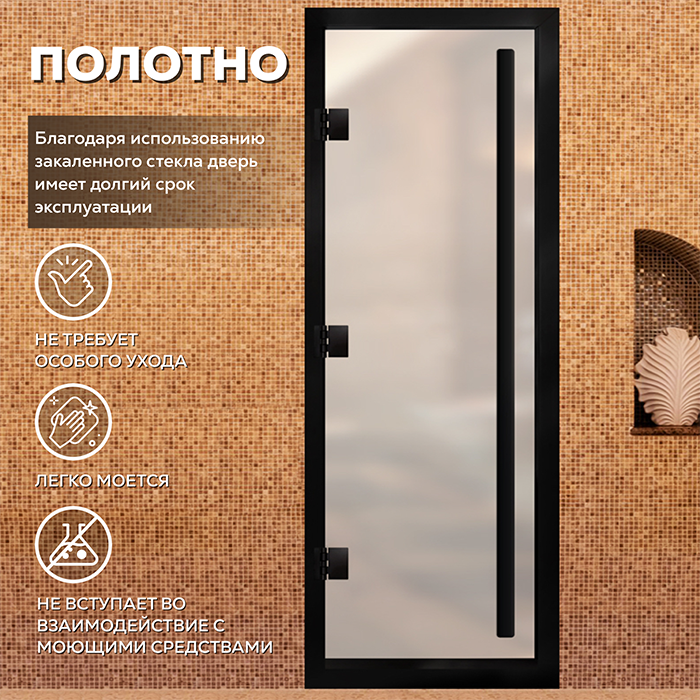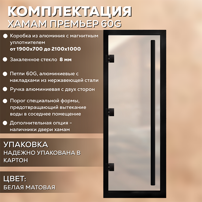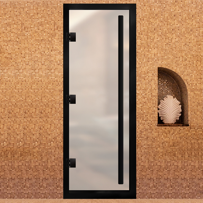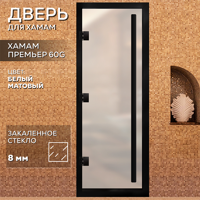 Новинка Стеклянная дверь для хамама Престиж с вертикальной ручкой Белая Матовая с черным профилем