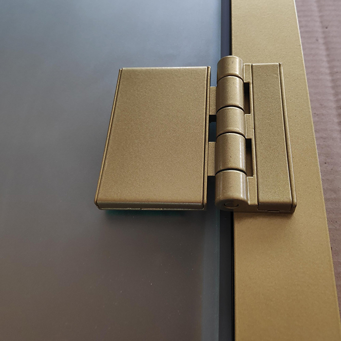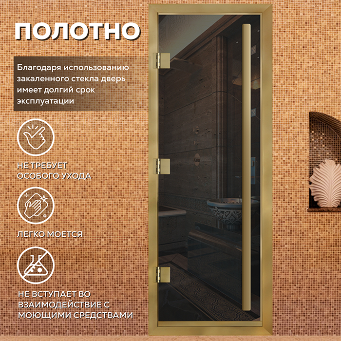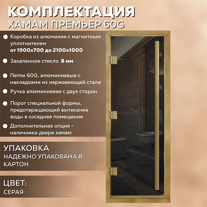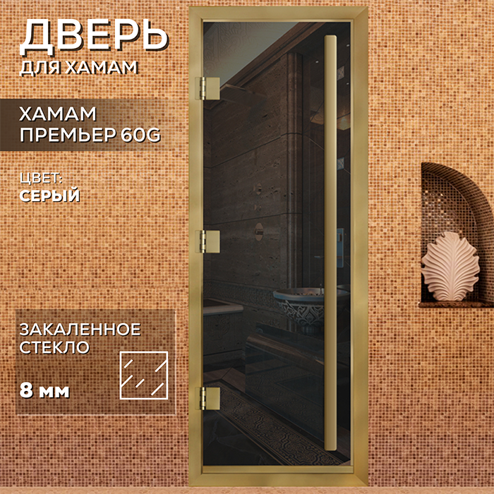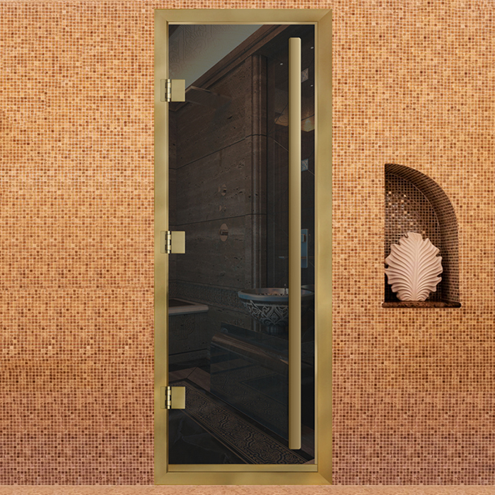 Стеклянная дверь для хамама Престиж с вертикальной ручкой Серая с профилем золото