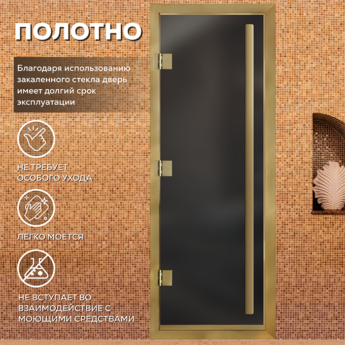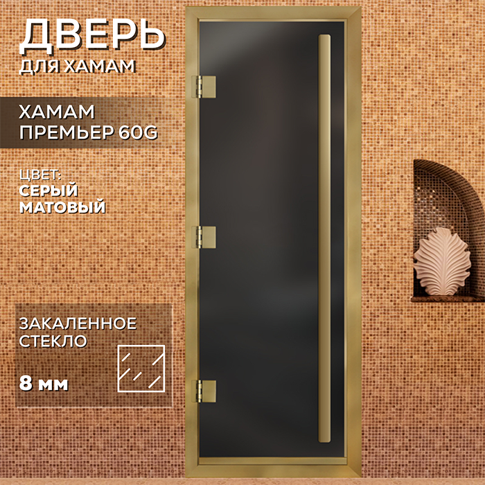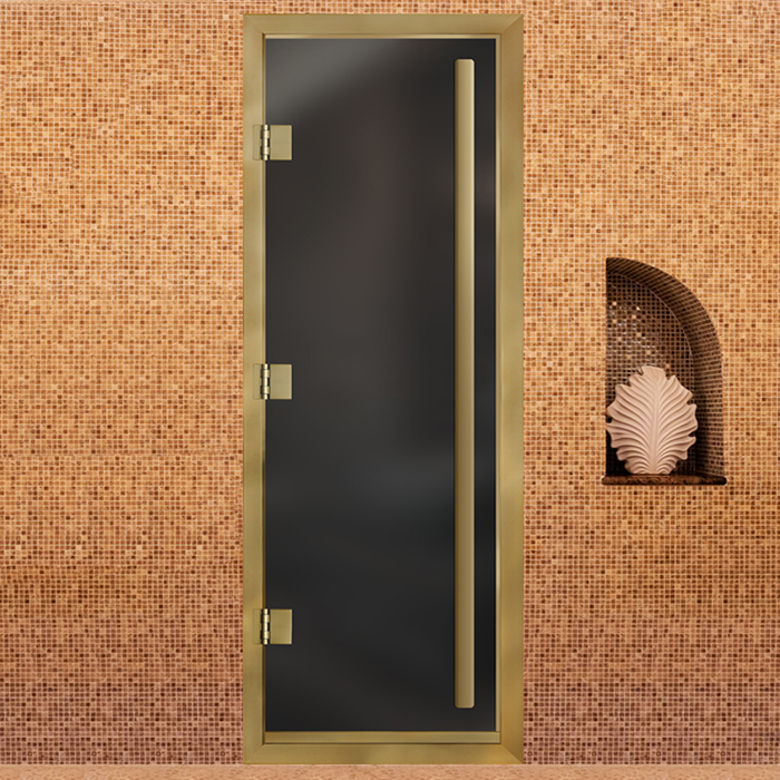 Стеклянная дверь для хамама Престиж с вертикальной ручкой Серая матовая с профилем золото