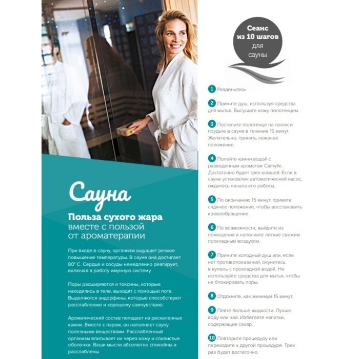 Ароматы для сауны Voile de Sauna полностью растворимы в воде. В этом их основное отличие от эфирных масел, которые остаются плавать на поверхности воды. В результате — масло сгорает на камнях, выделяя вредные вещества. Растворите состав Camylle в ковше, из расчета 10-20 мл на литр воды, плесните на каменку и почувствуйте разницу.
